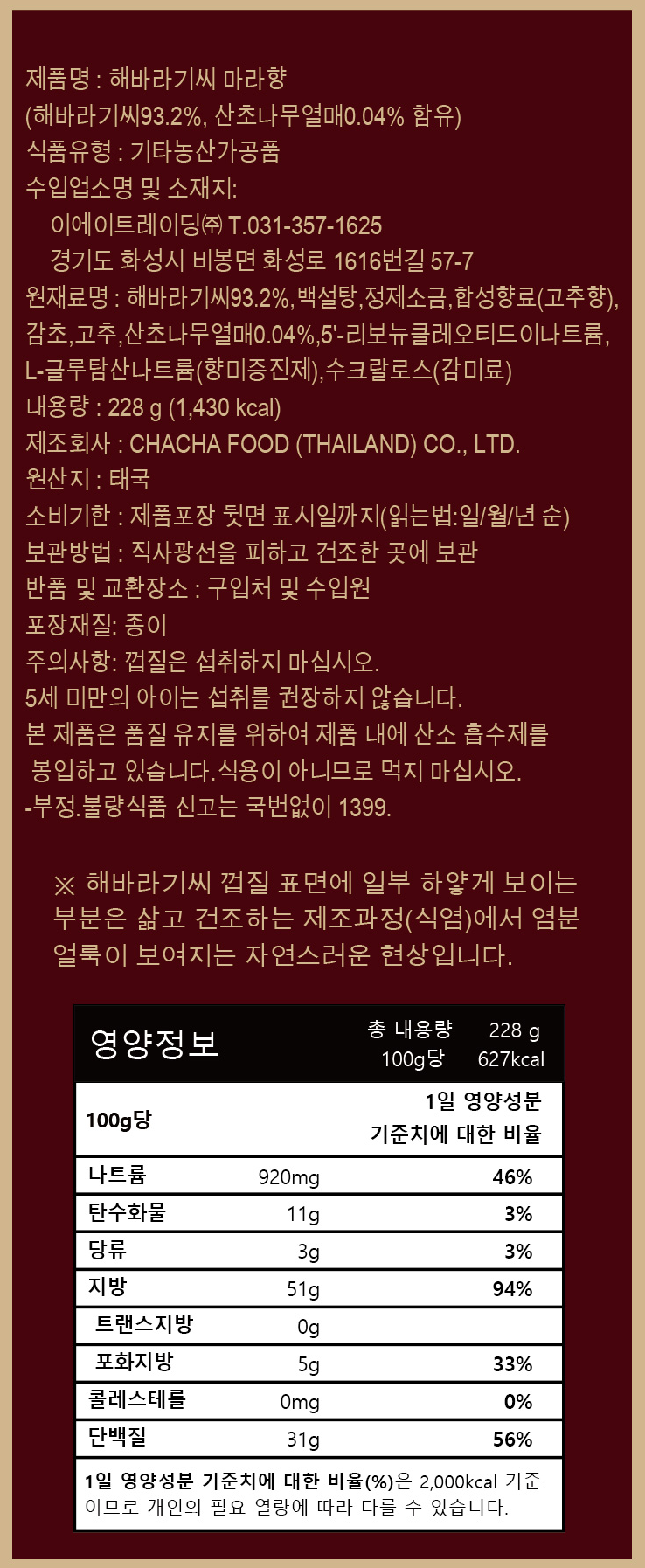 - HOME > ÇØ¹Ù¶ó±â¾¾ | Íþí > ÃÃ ÇØ¹Ù¶ó±â¾¾(¸¶¶ó¸À/228g) Chacheer Sunflower seeds mara flavour 228g - 1¹Ú½º(20ºÀÁö)